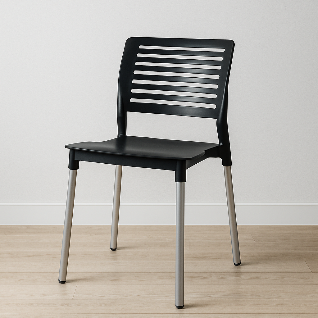 Silla ligera, cómoda y apilable, diseñada para uso intensivo en espacios interiores o exteriores.